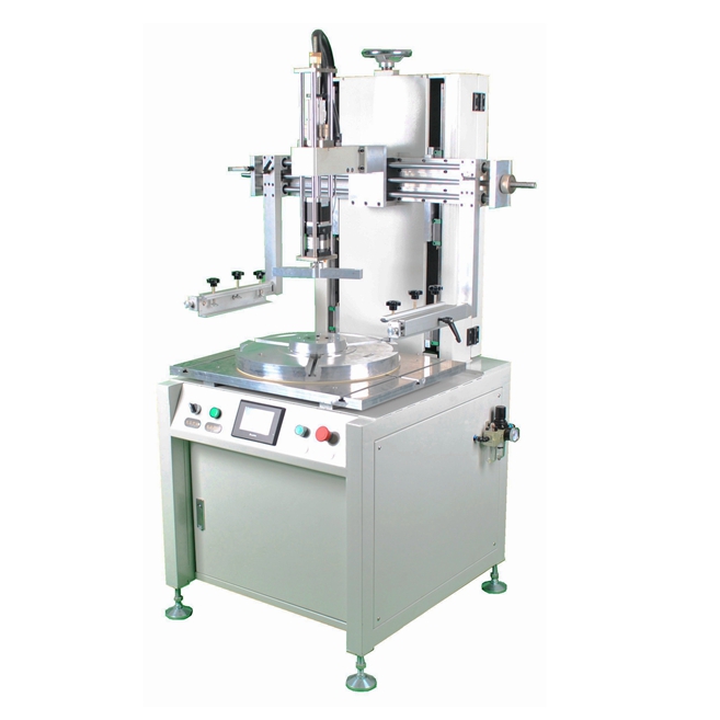 針對印刷面下凹的圓盤形產(chǎn)品,普通的絲印機(jī)平移運動的刮刀無法完成印刷。我司為此開發(fā)了旋轉(zhuǎn)刮刀式絲印機(jī),可以有效解決環(huán)狀下凹表面的印刷問題。